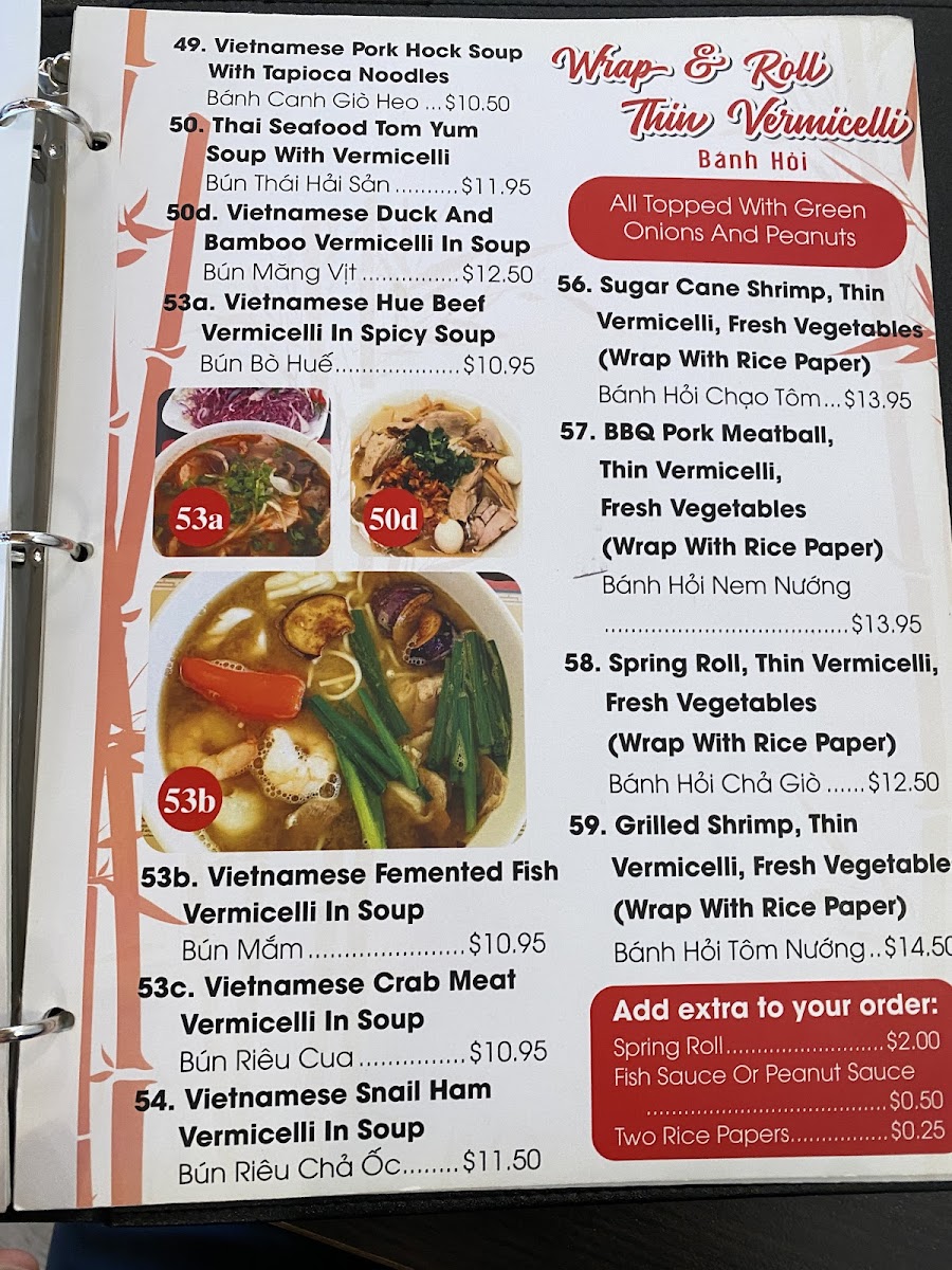 Another standout is the Bun Bo Hue, which is praised for its rich umami flavor and spicy kick. Hertz Vaughan describes this dish as beautifully presented, promising an explosion of flavor with every bite. Complementing these main dishes are an array of appetizers, including their Deep Fried Spring Rolls and Grilled Pork Salad Rolls, both of which are perfect for sharing or enjoying on your own.